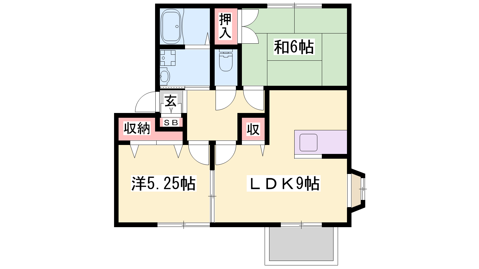 - LDK9帖、洋室5.25帖、和室6帖