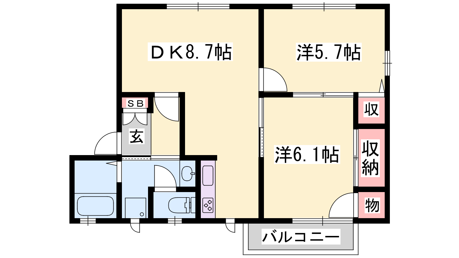 - DK8.7帖、洋室6.1帖、洋室5.8帖