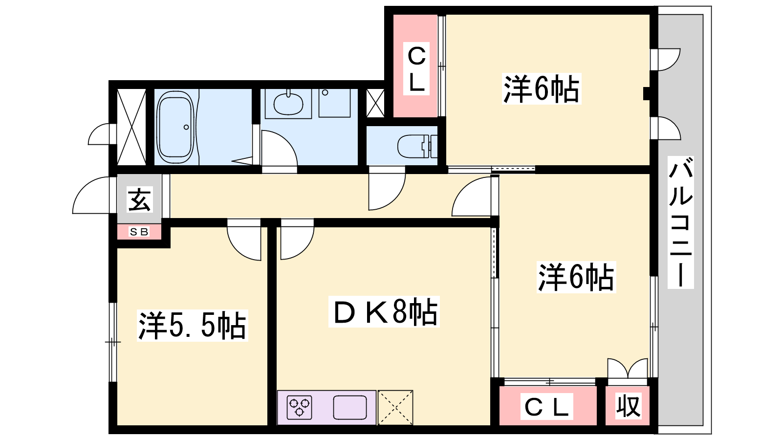 - DK8帖、洋室6帖、洋室6帖、洋室5.5帖