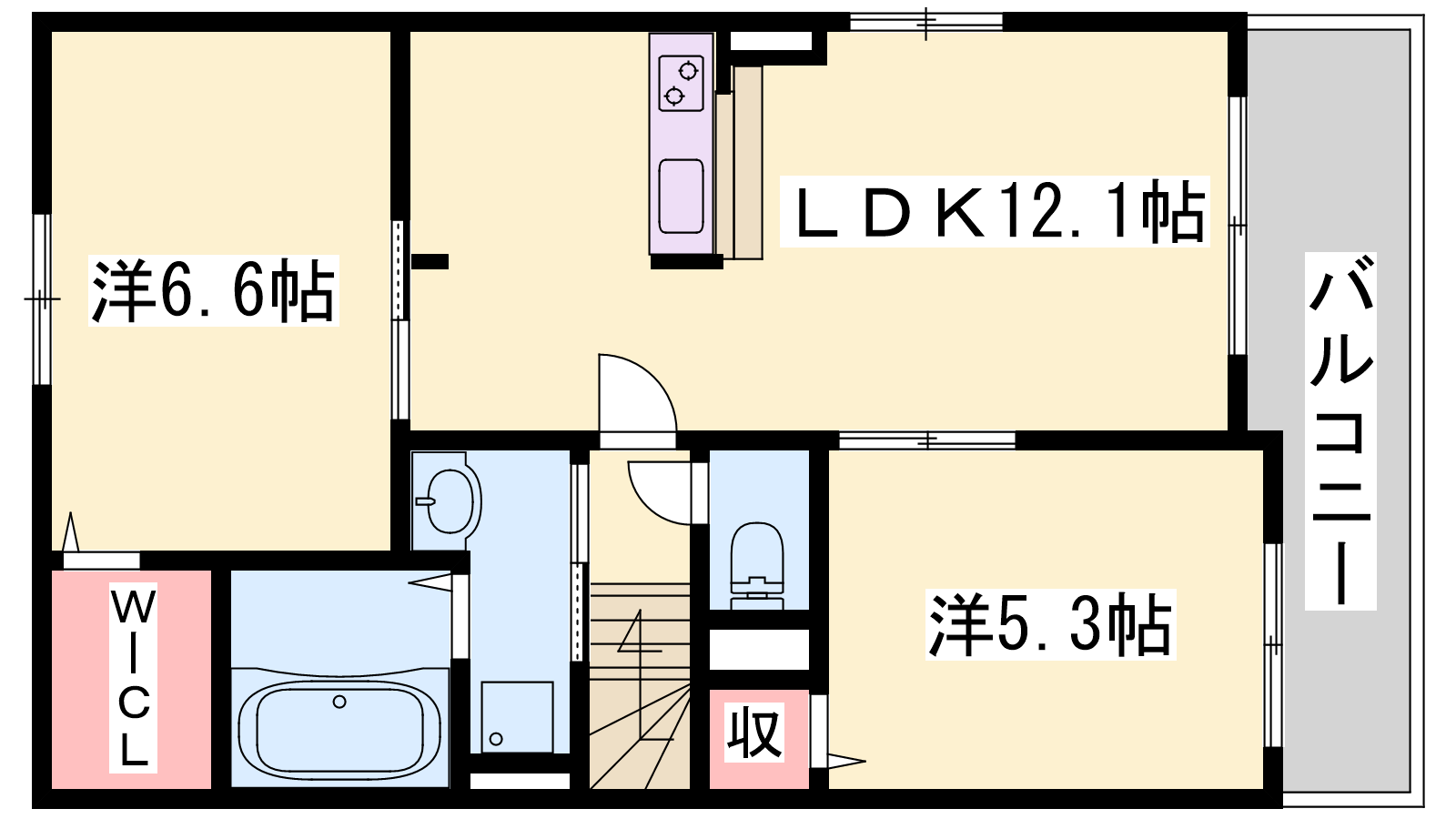 - LDK12.1帖、洋室6.6帖、洋室5.3帖