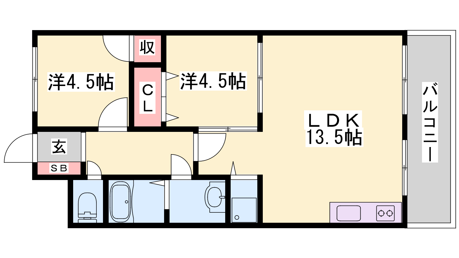 - LDK13.5帖、洋室4.5帖、洋室4.5帖