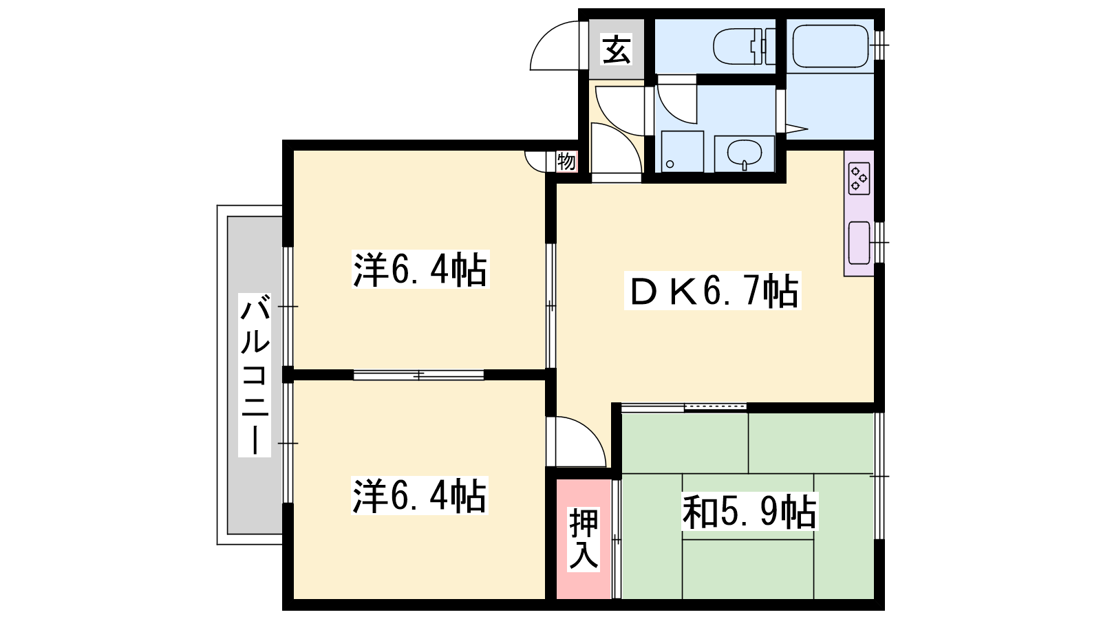 - DK6.7帖、洋室6.4帖、洋室6.4帖、和室5.9帖