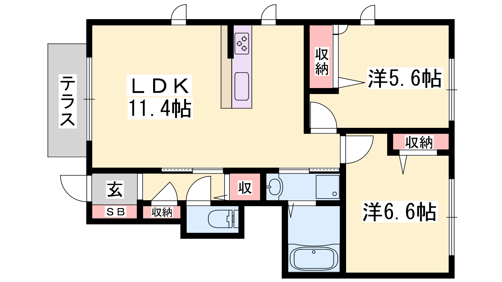 - LDK11.4帖、洋室6.6帖、洋室5.6帖