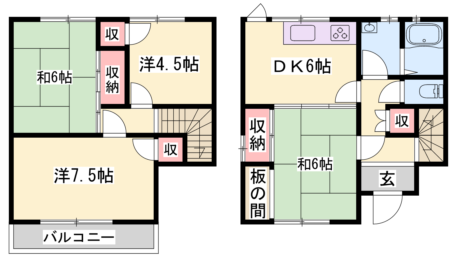 - DK6帖、和室6帖、洋室7.5帖、洋室4.5帖、和室6帖
