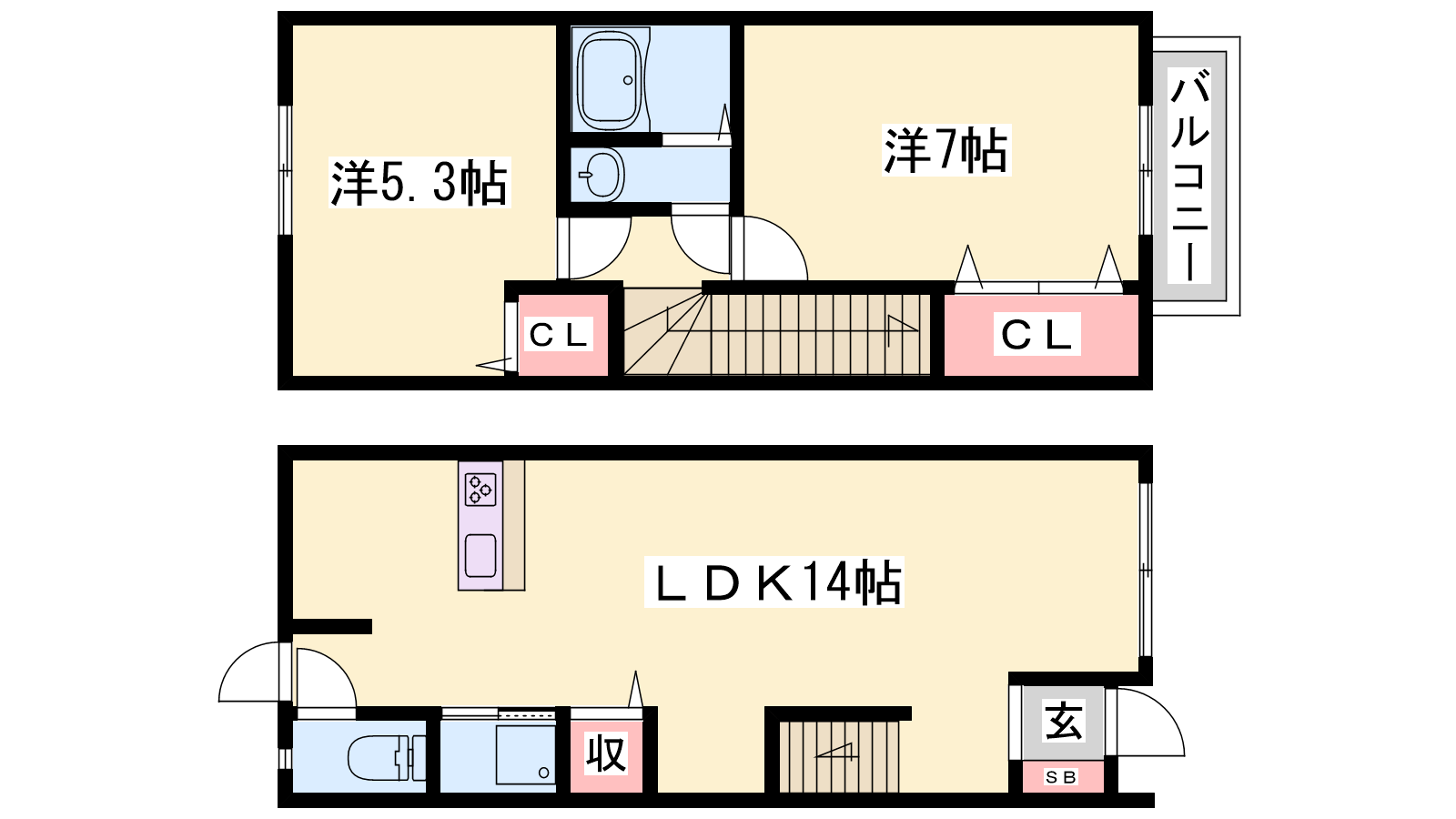 - LDK14帖、洋室7帖、洋室5.3帖