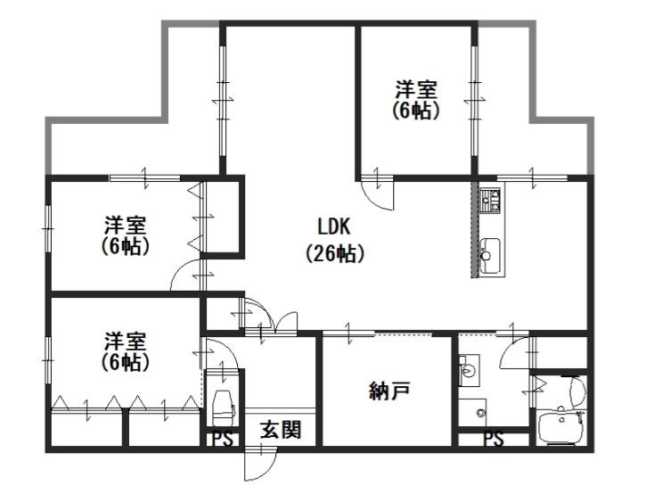 - LDK26帖、洋室6帖、洋室6帖、洋室6帖