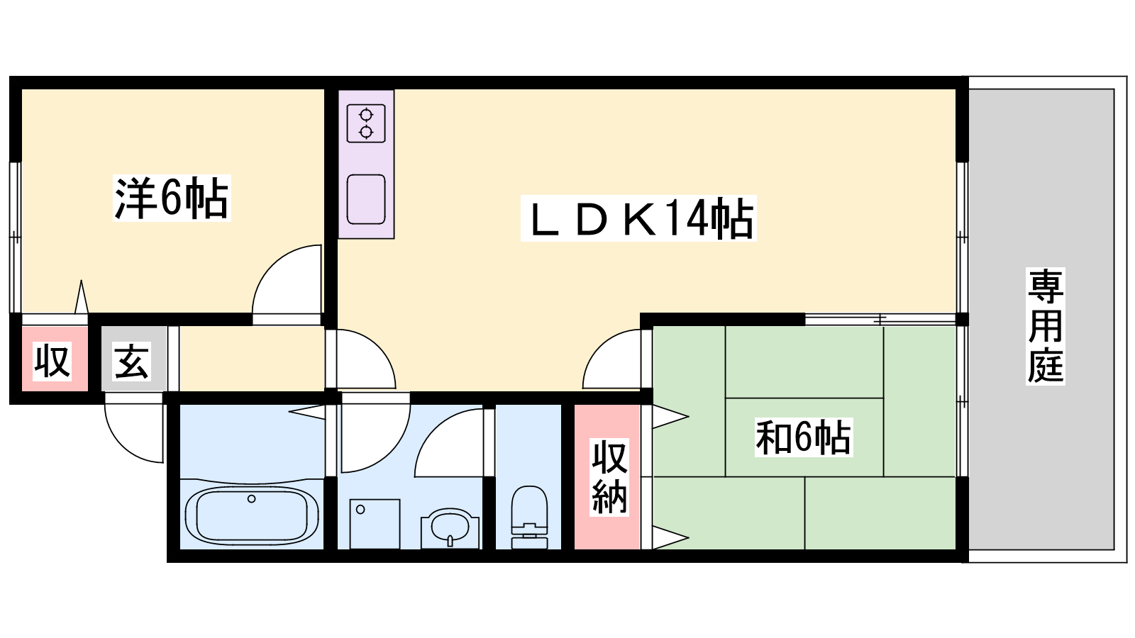 - LDK14帖、洋室6帖、洋室6帖