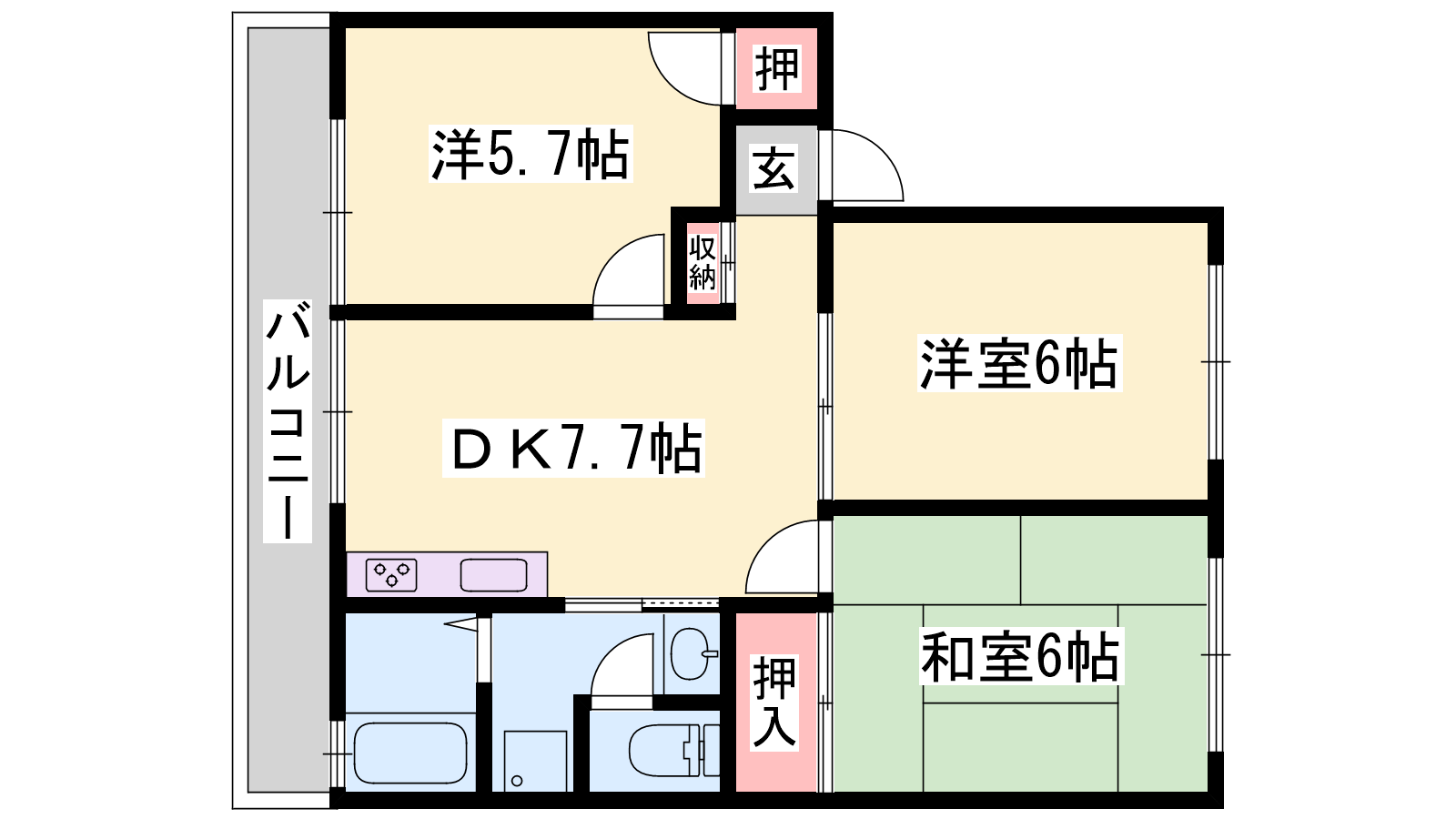 - DK7.7帖、洋室6帖、洋室5.7帖、和室6帖