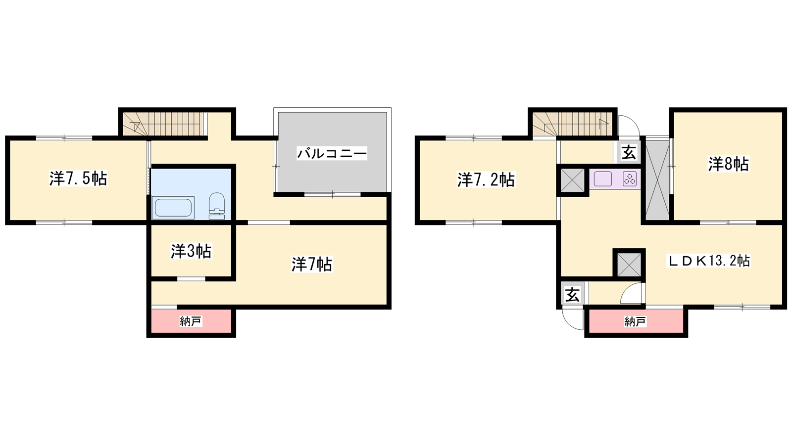 - LDK13.2帖、洋室8帖、洋室7.5帖、洋室7帖、洋室3帖