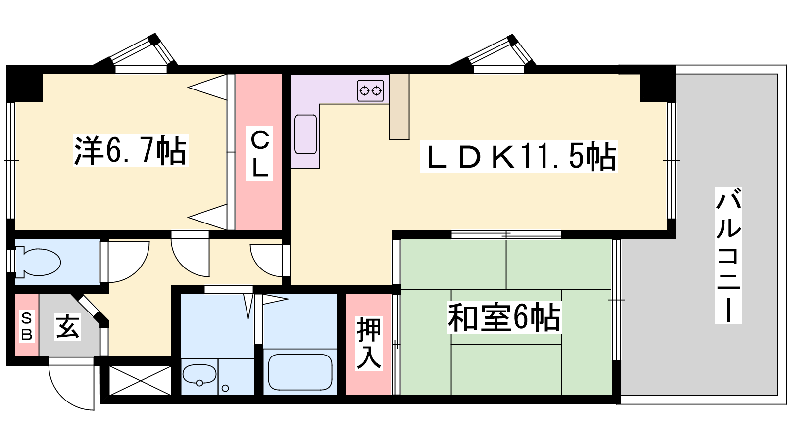 - LDK11.5帖、洋室6.7帖、和室6帖