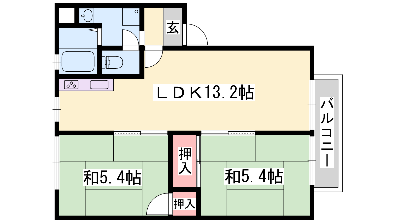 - LDK13.2帖、和室5.4帖、和室5.4帖