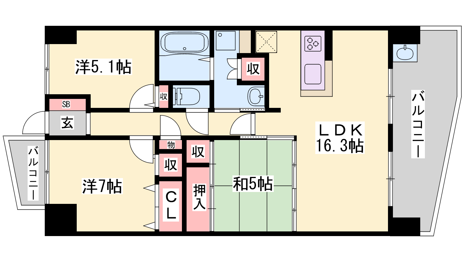 - LDK16.3帖、洋室7帖、洋室5.1帖、和室5帖