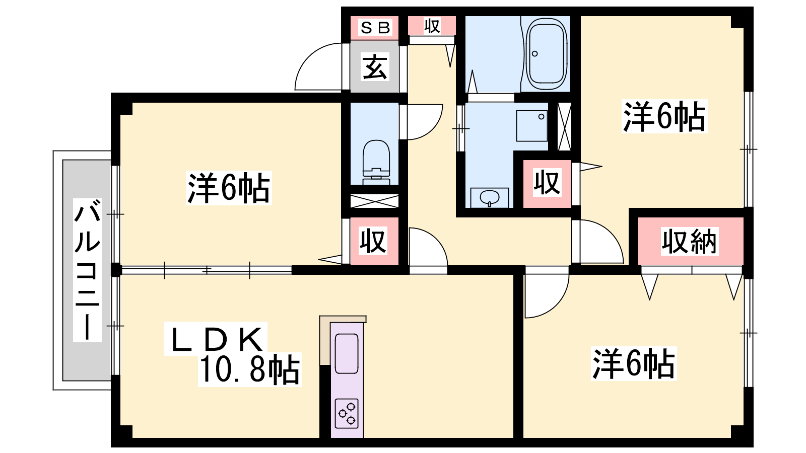 - LDK10.8帖、洋室6帖、洋室6帖、洋室6帖