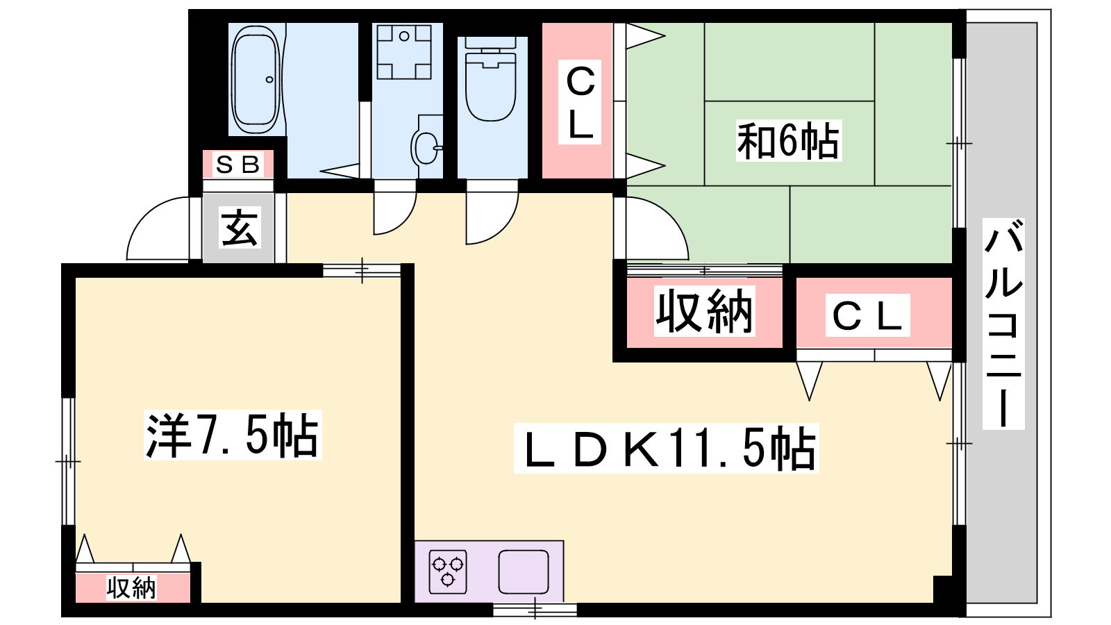 - LDK11.5帖、洋室7.5帖、和室6帖