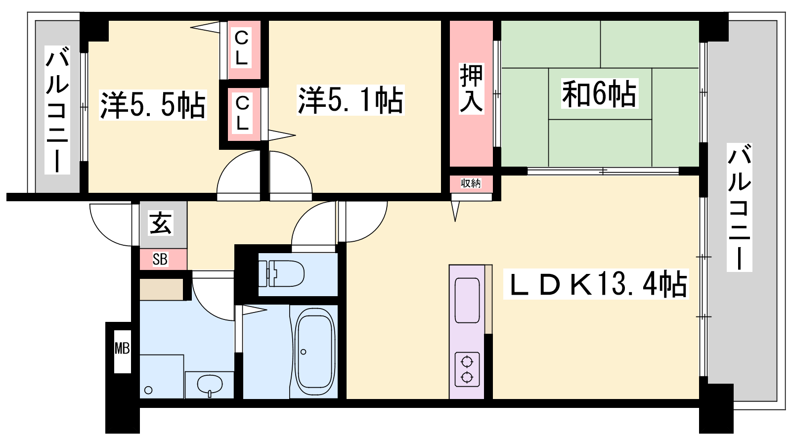 - LDK13.4帖、洋室5.5帖、洋室5.1帖、和室6帖
