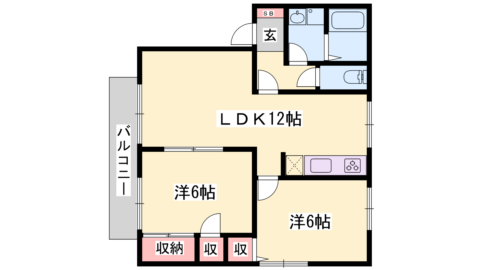 - LDK12帖、洋室6帖、洋室6帖