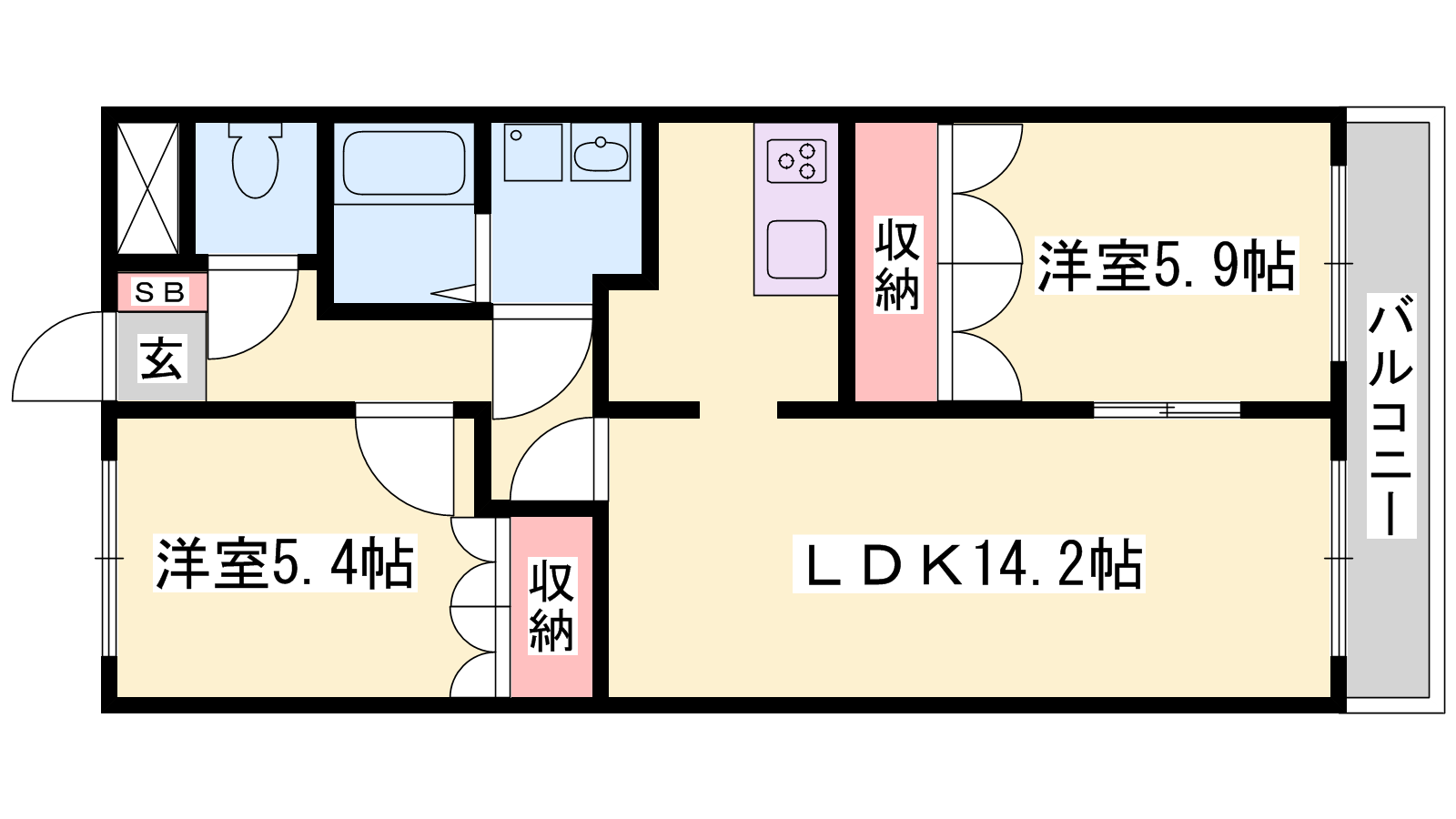 - LDK14.2帖、洋室5.9帖、洋室5.4帖
