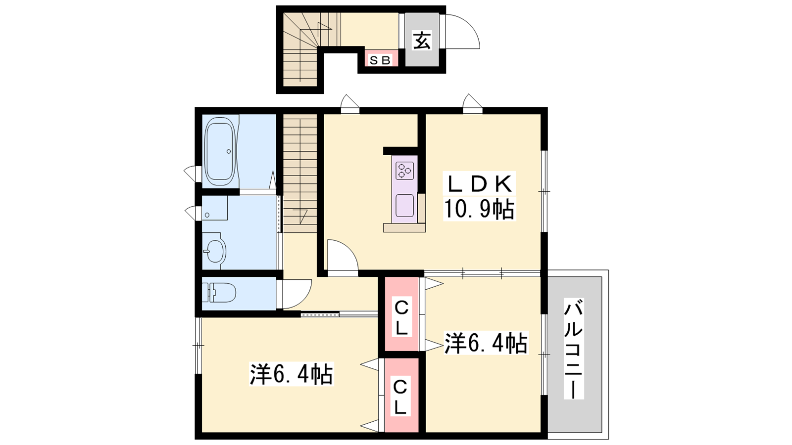 - LDK10.7帖、洋室6.4帖、洋室6.4帖