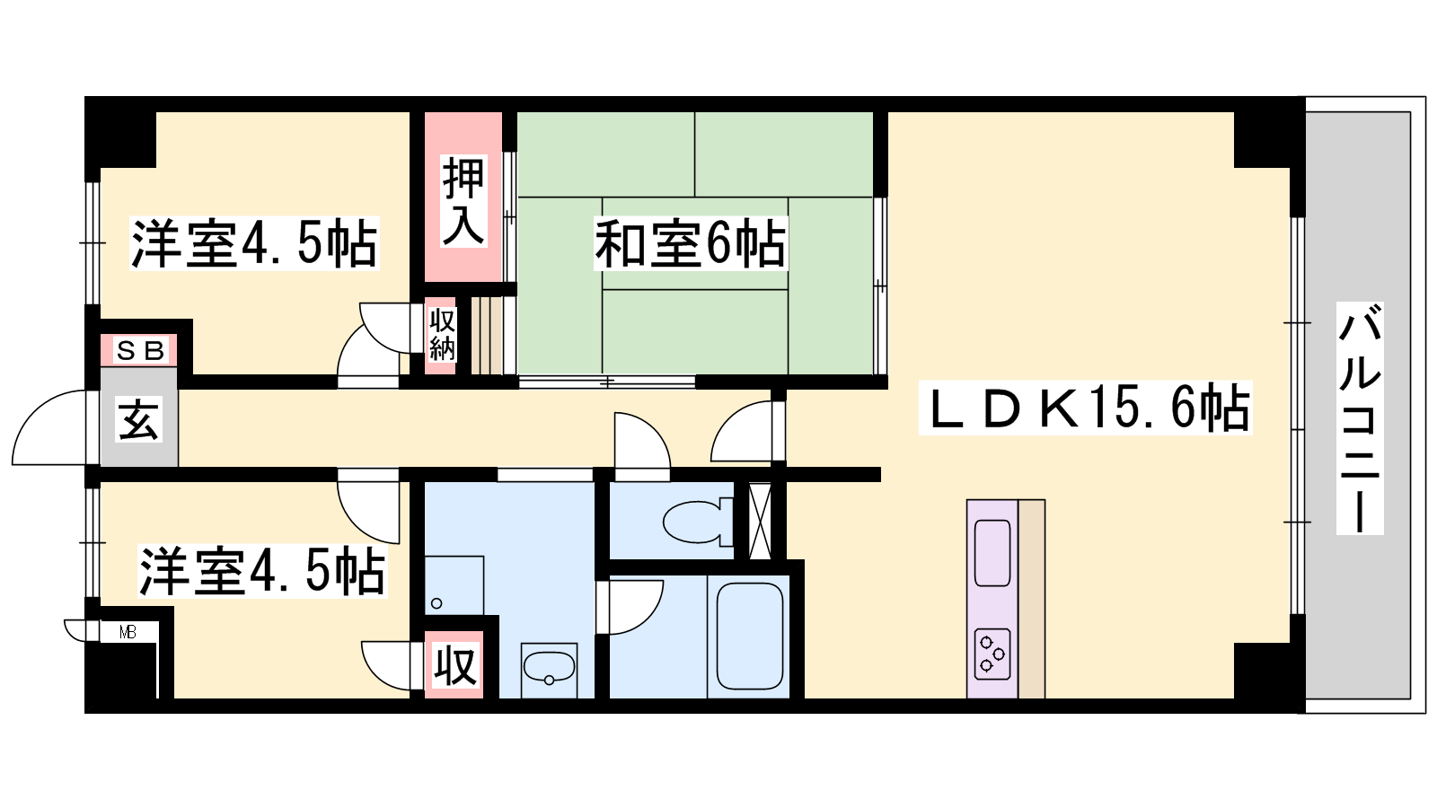 - LDK15.6帖、和室6帖、洋室4.5帖、洋室4.5帖