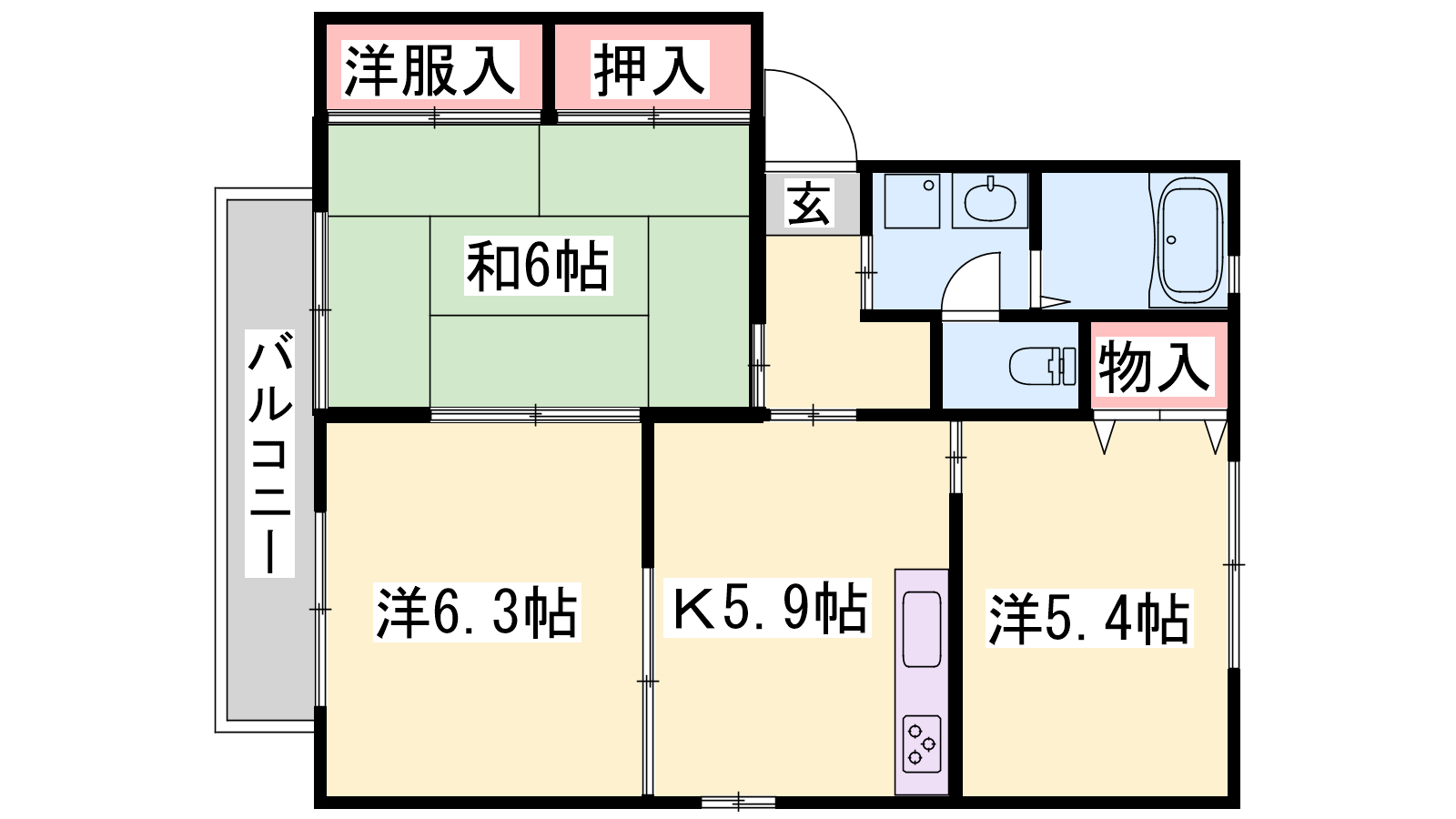 - K5.9帖、和室6帖、洋室6.3帖、洋室5.4帖