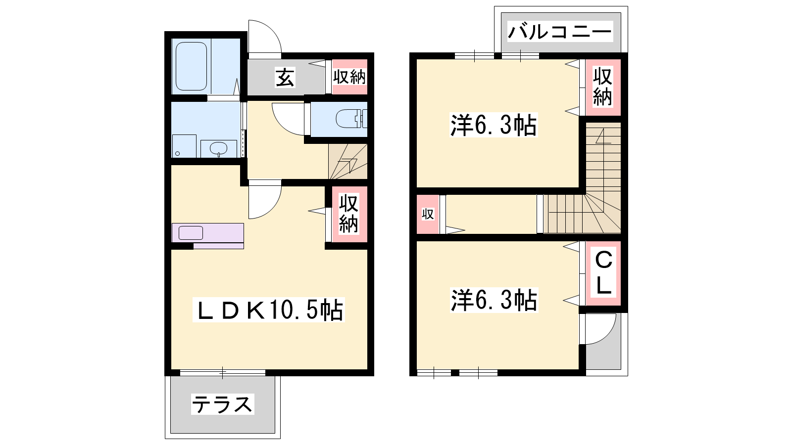 - LDK10.5帖、洋室6.3帖、洋室6.3帖