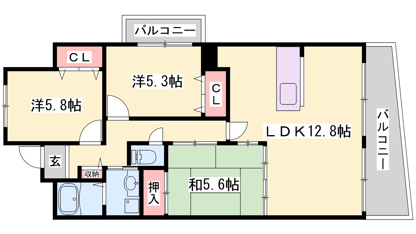 - LDK12.8帖、洋室5.8帖、洋室5.3帖、和室5.6帖