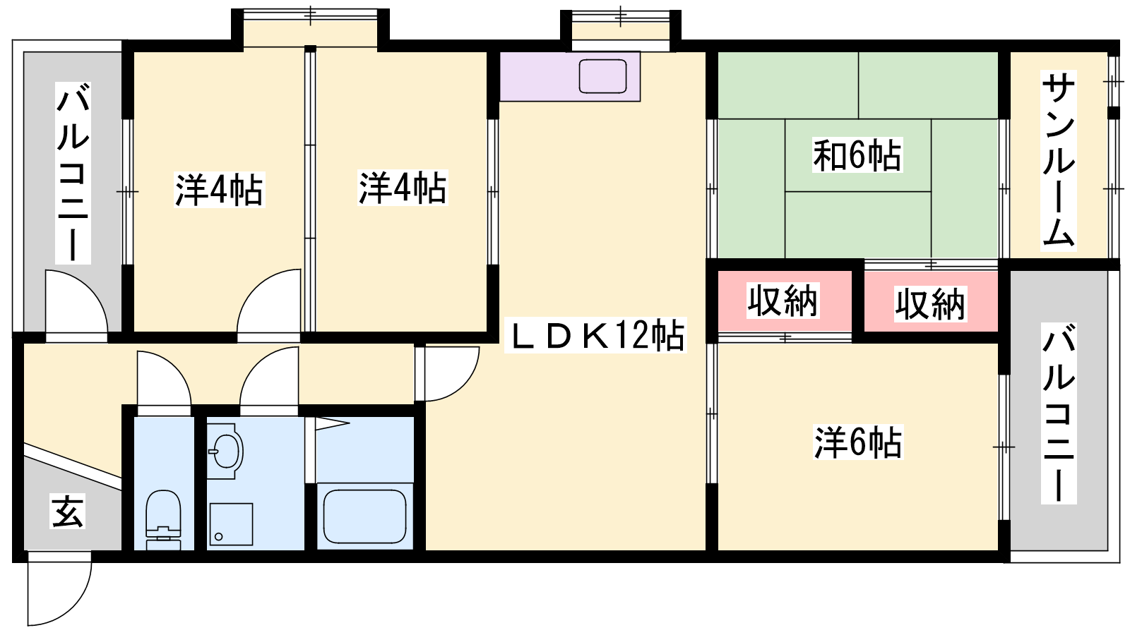 - LDK12帖、洋室6帖、洋室4帖、和室6帖