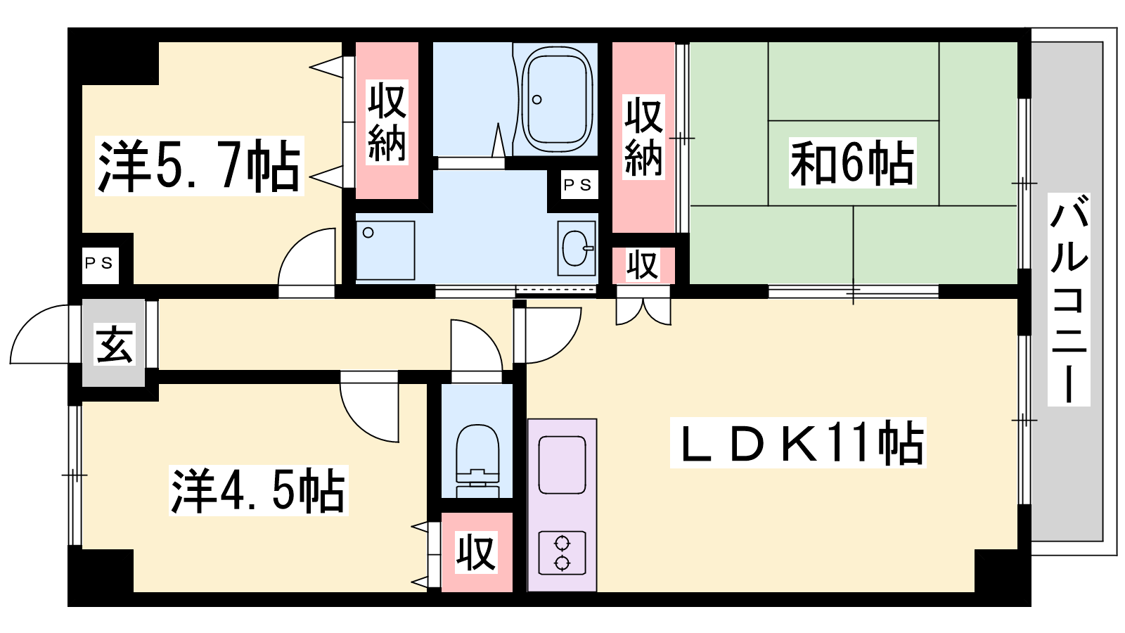 - LDK12帖、洋室5.7帖、洋室4.5帖、和室6帖