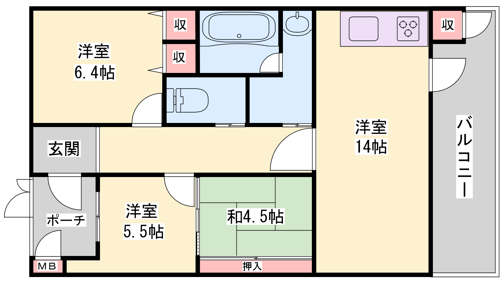 - LDK14帖、洋室6.4帖、洋室5.5帖、和室4.5帖
