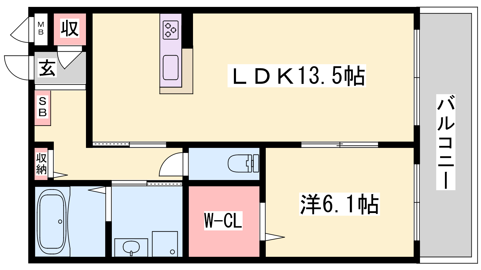 - LDK13.5帖、洋室6.1帖