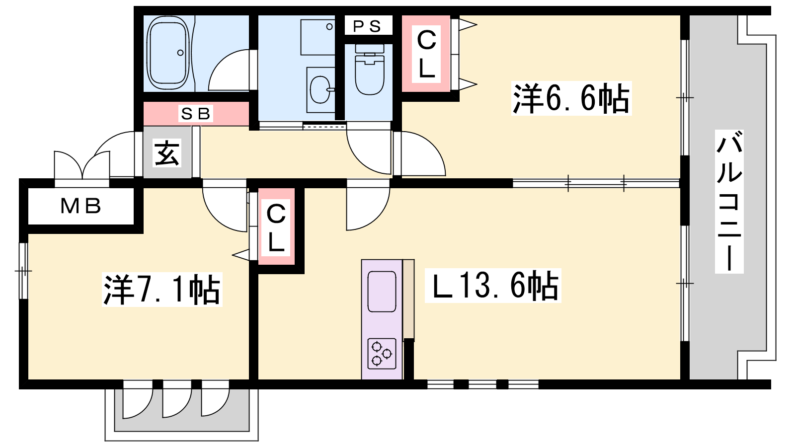 - LDK13.6帖、洋室7.1帖、洋室6.6帖
