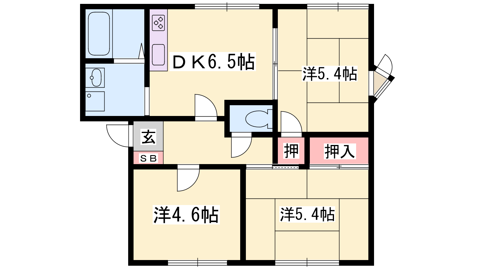- DK6.5帖、洋室4.6帖、洋室5.4帖、洋室5.4帖