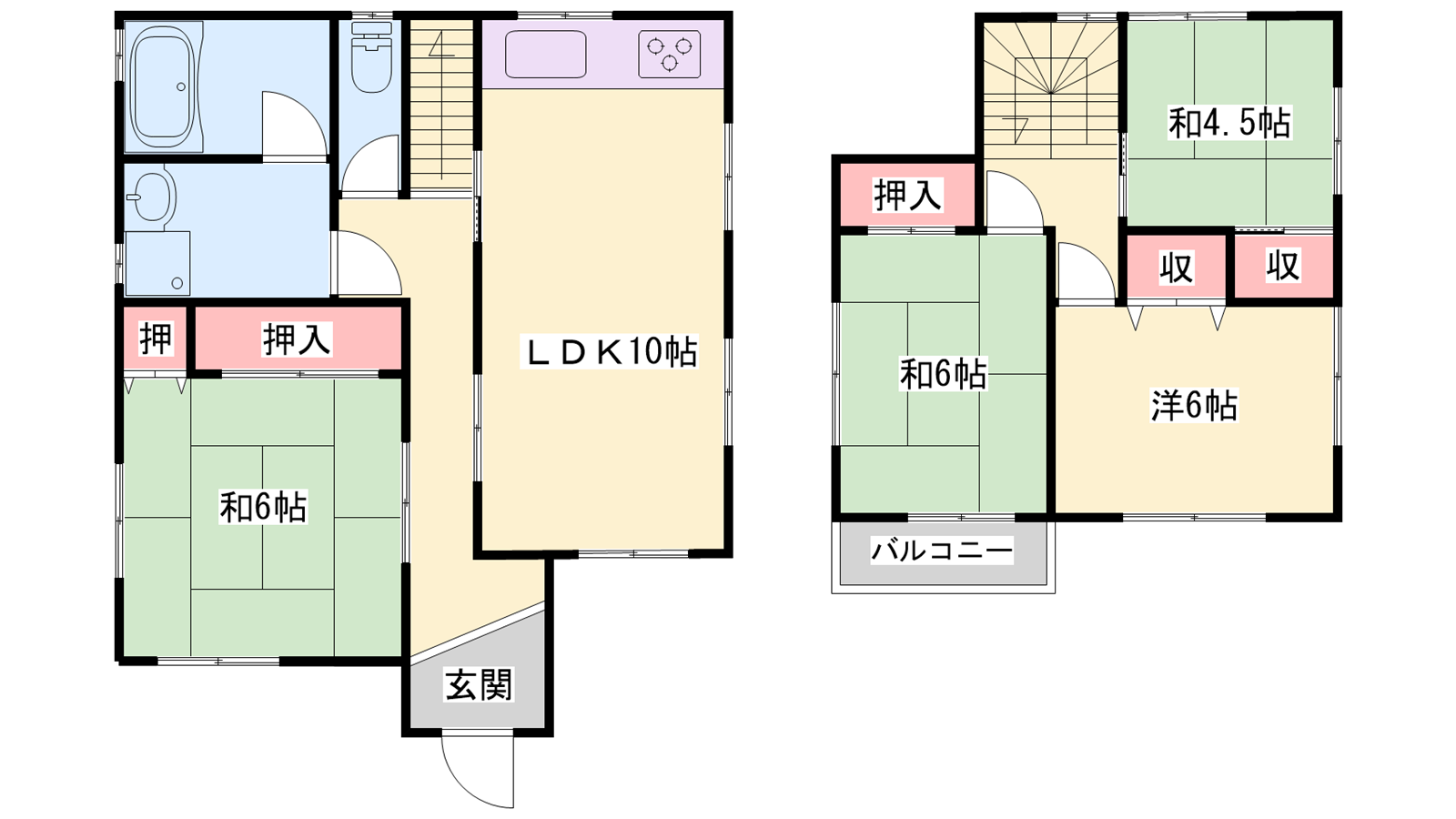 - LDK10帖、和室6帖、和室6帖、洋室6帖、洋室4.5帖