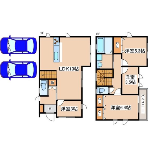 - LDK13帖、洋室6.4帖、洋室5.3帖、洋室3.5帖、洋室3帖