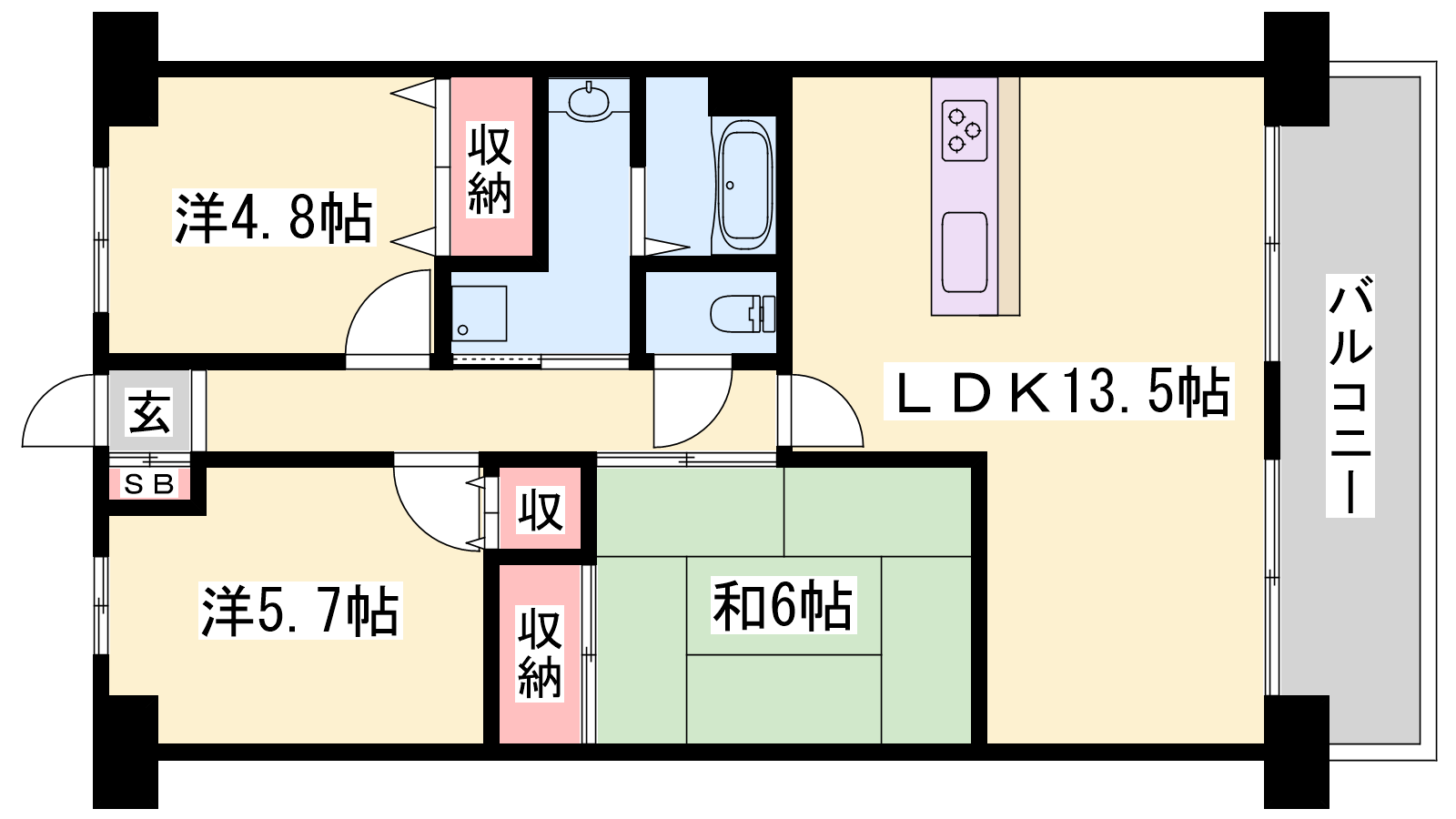 - LDK13.5帖、和室6帖、洋室5.7帖、洋室4.8帖