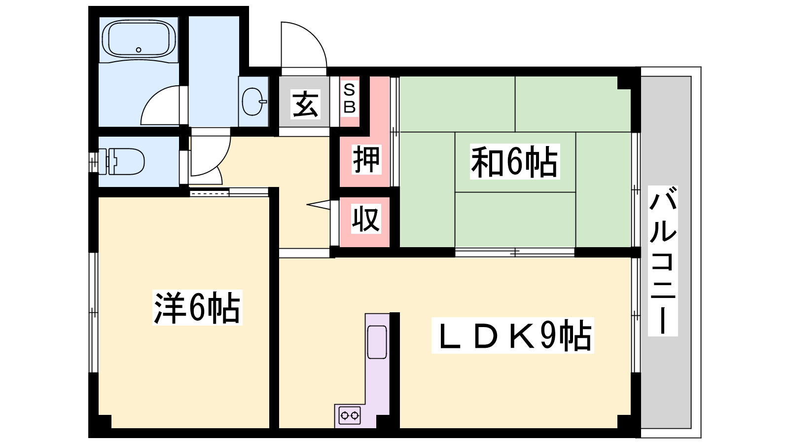 - LDK9帖、洋室6帖、和室6帖