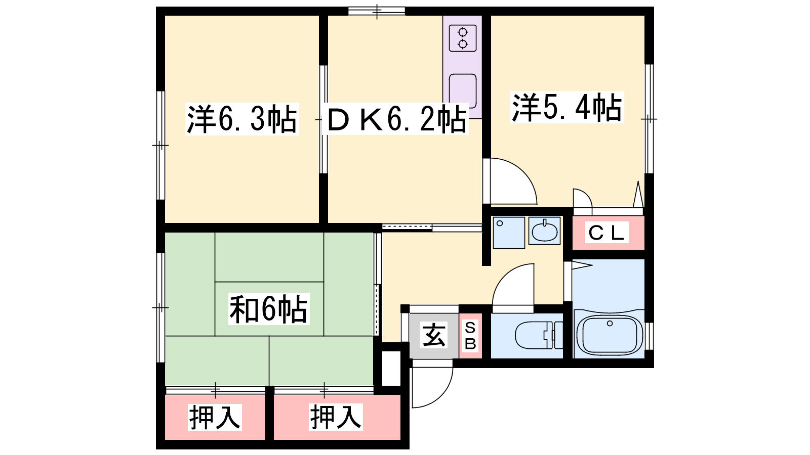 - DK6.2帖、洋室6.3帖、洋室5.4帖、和室6.3帖