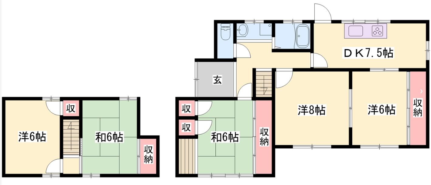 - DK7.5帖、洋室6帖、洋室8帖、和室6帖、洋室6帖、和室6帖