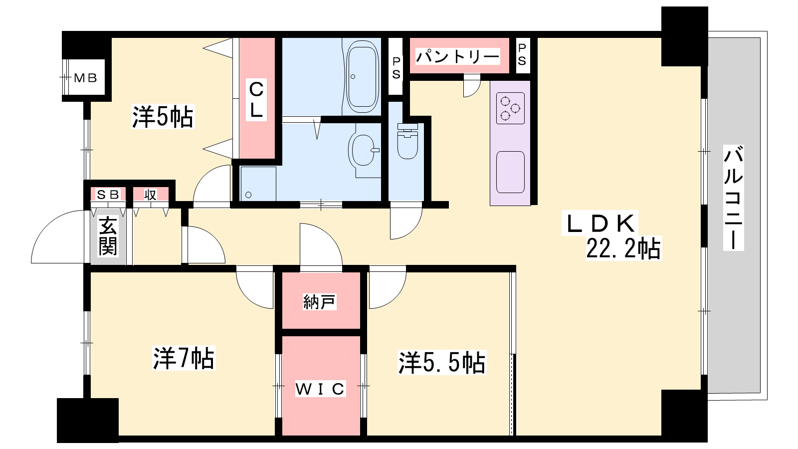 - LDK22.2帖、洋室7帖、洋室5.5帖、洋室5帖