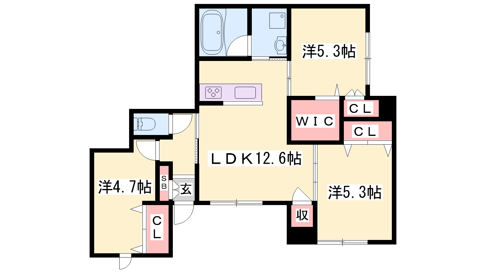 - LDK12.6帖、洋室5.3帖、洋室5.3帖、洋室4.7帖