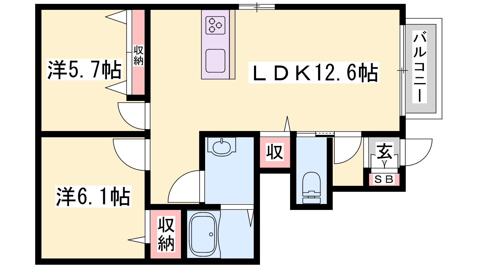 - LDK12.6帖、洋室6.1帖、洋室5.7帖