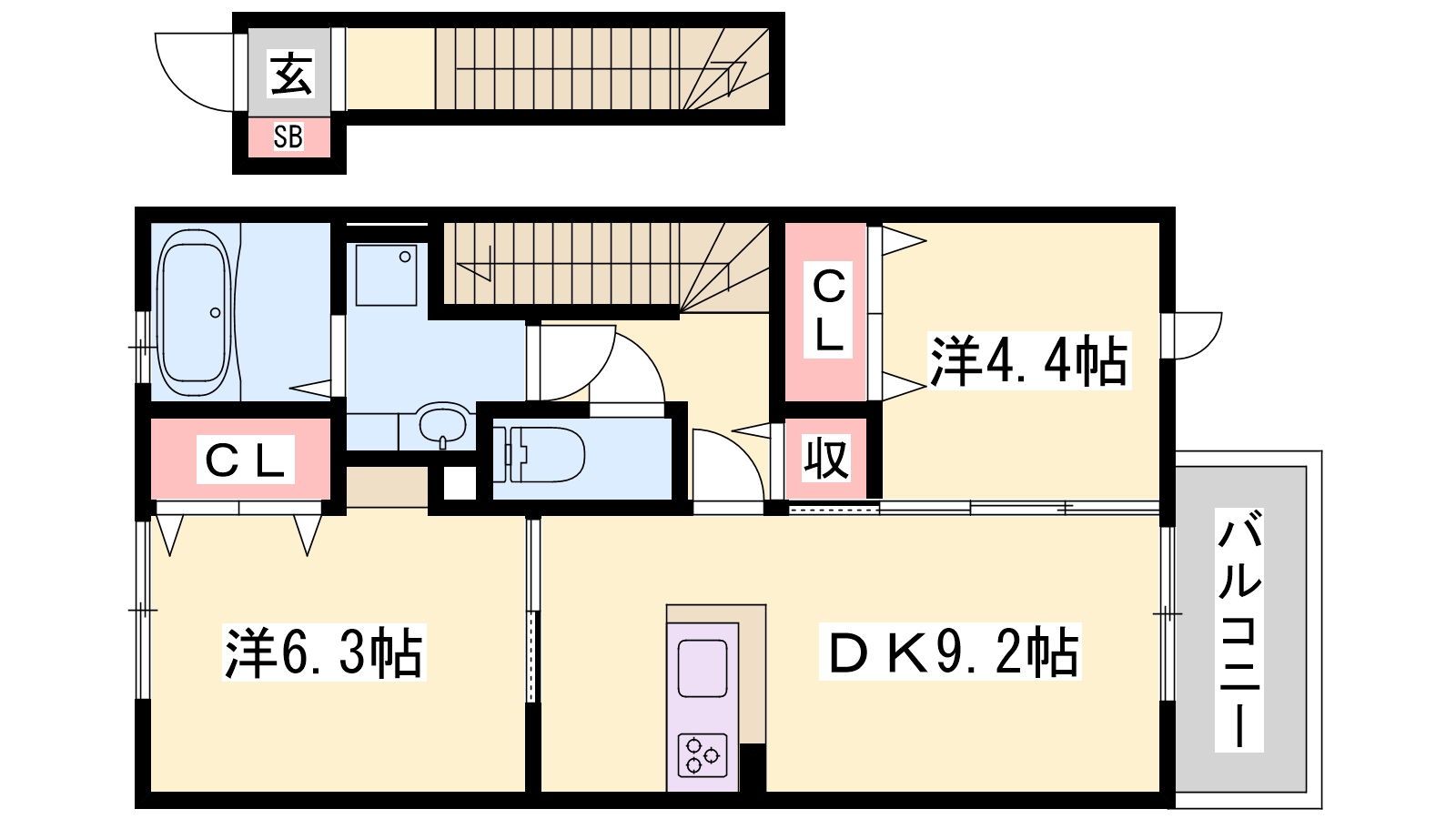 - DK9.2帖、洋室6.3帖、洋室4.4帖