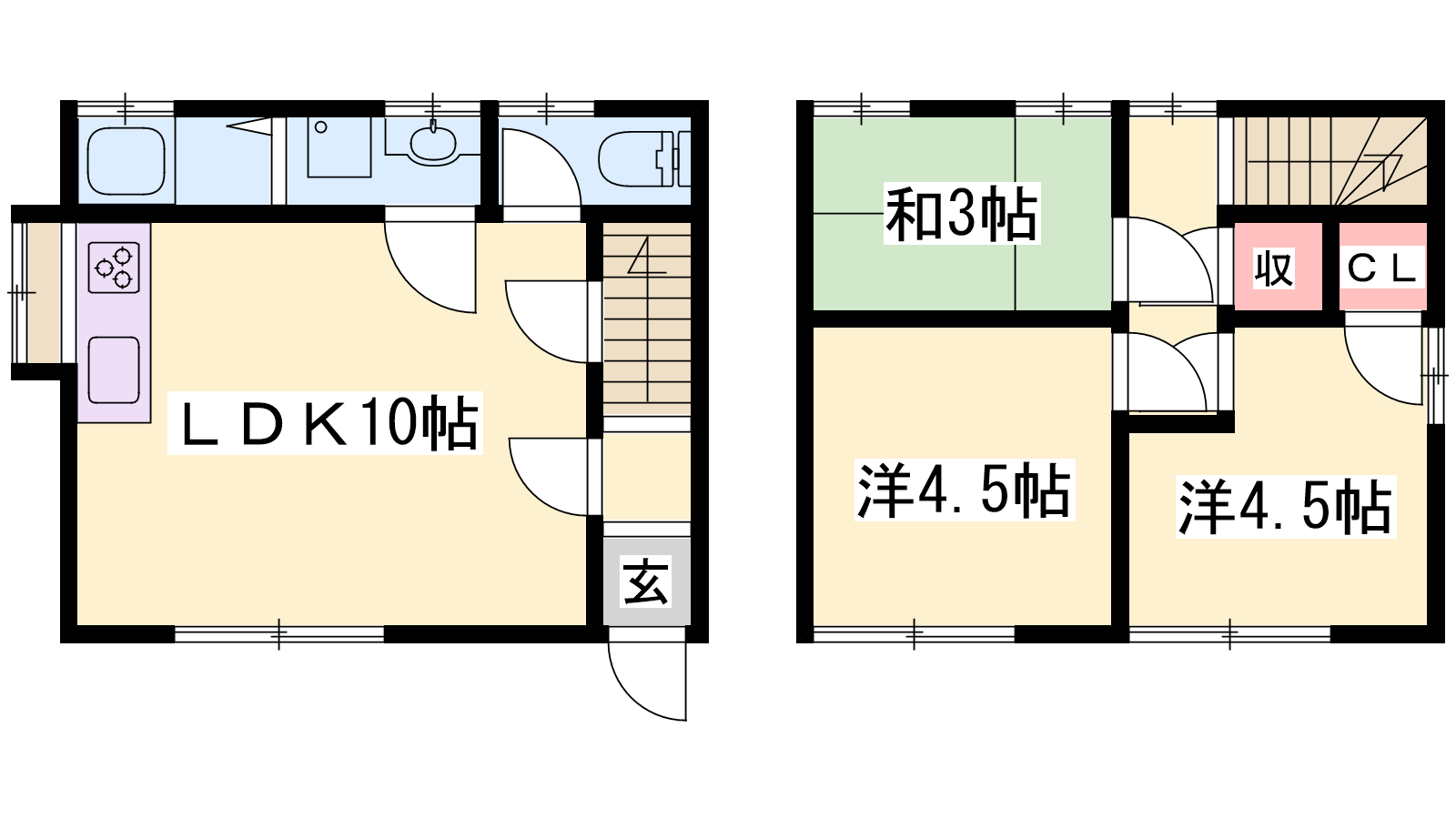- LDK10帖、洋室4.5帖、洋室4帖、和室3帖
