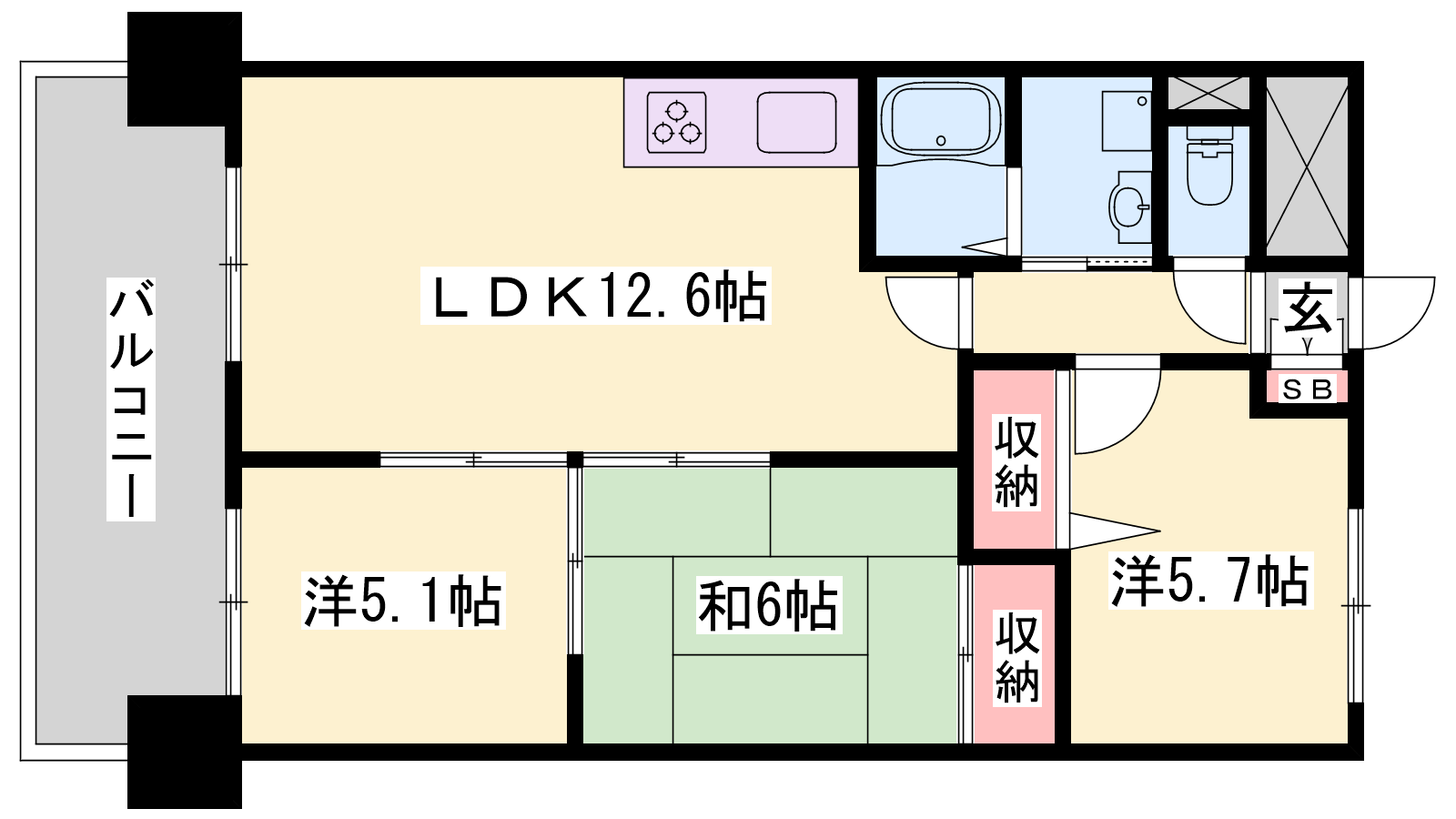 - LDK12.6帖、洋室5.7帖、洋室5帖、和室6帖