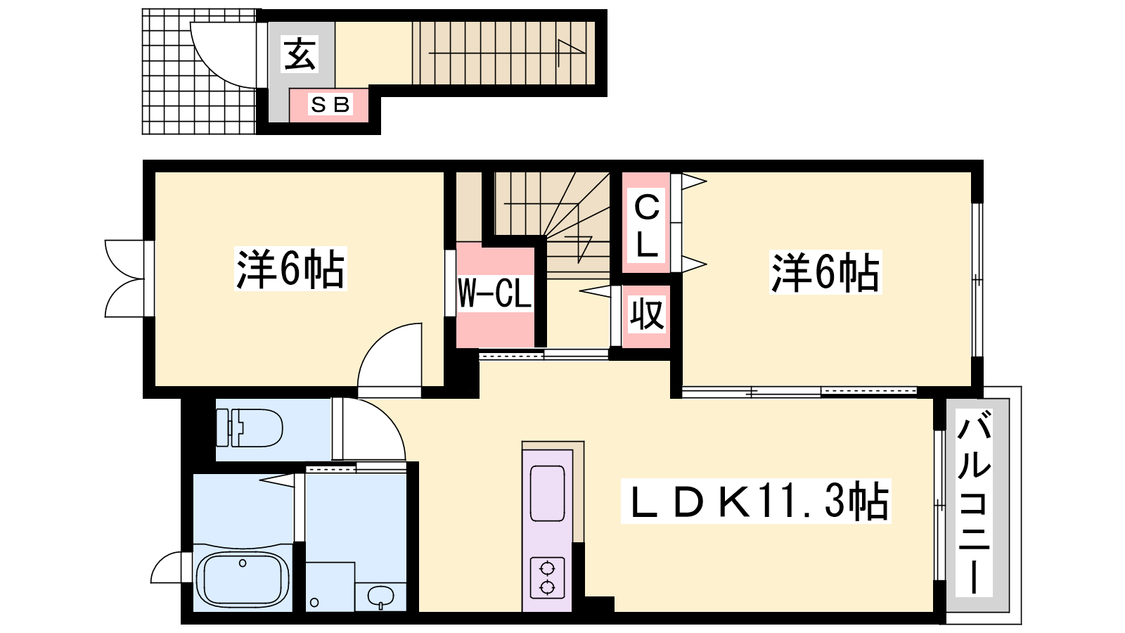 - LDK11.3帖、洋室6帖、洋室6帖