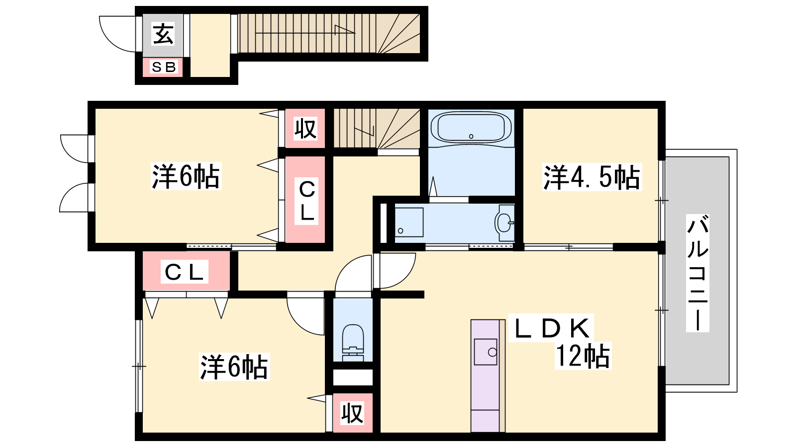 - LDK12帖、洋室6帖、洋室6帖、洋室4.5帖