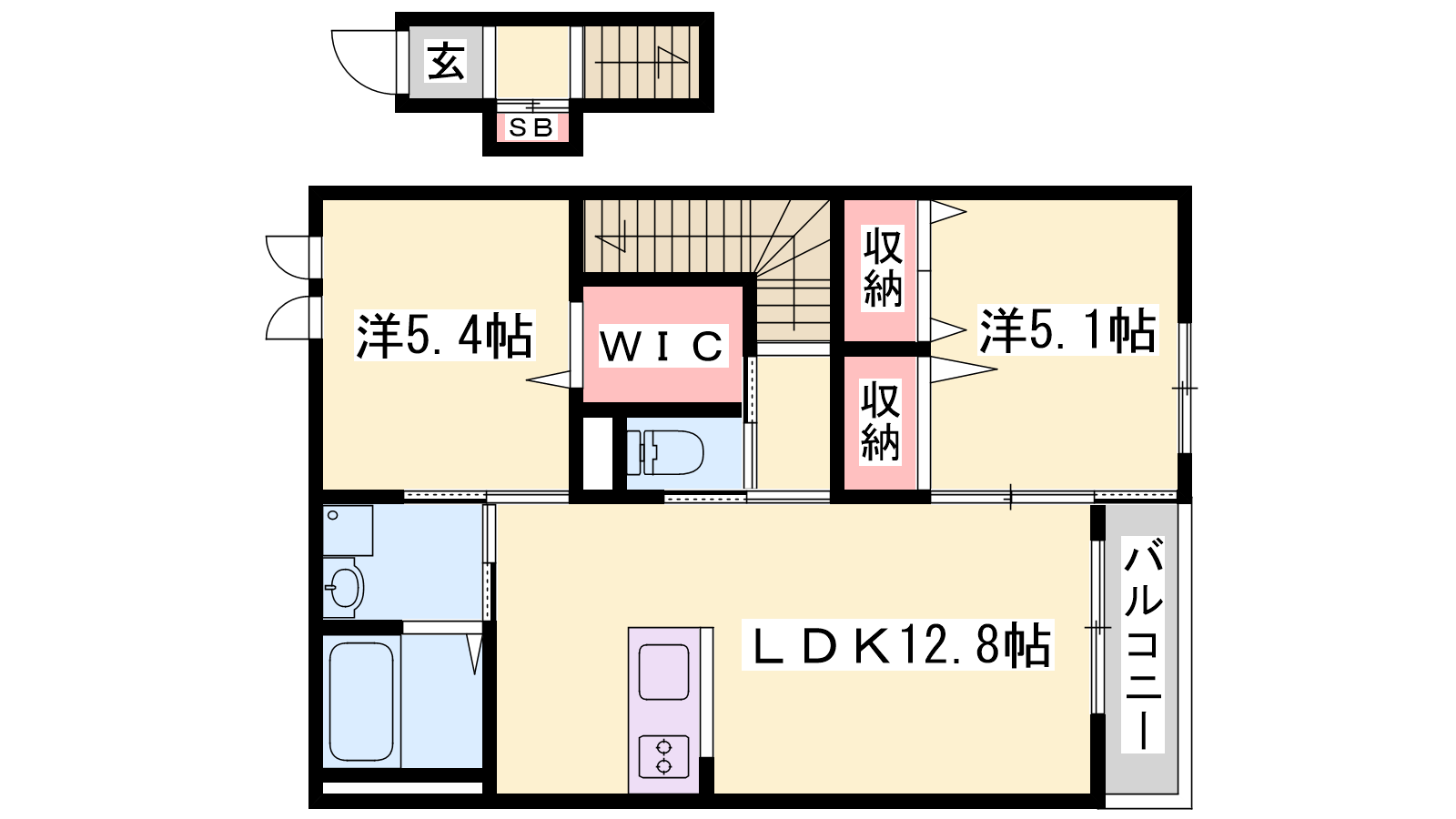 - LDK12.8帖、洋室5.4帖、洋室5.1帖
