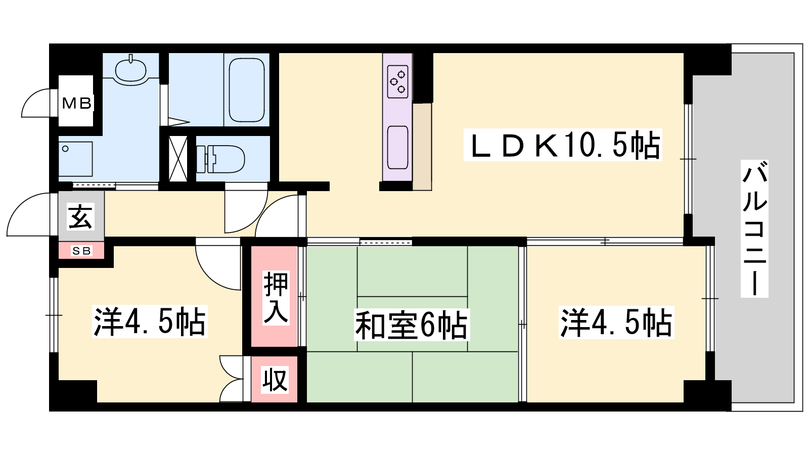 - LDK10.5帖、和室6帖、洋室4.5帖、洋室4.5帖