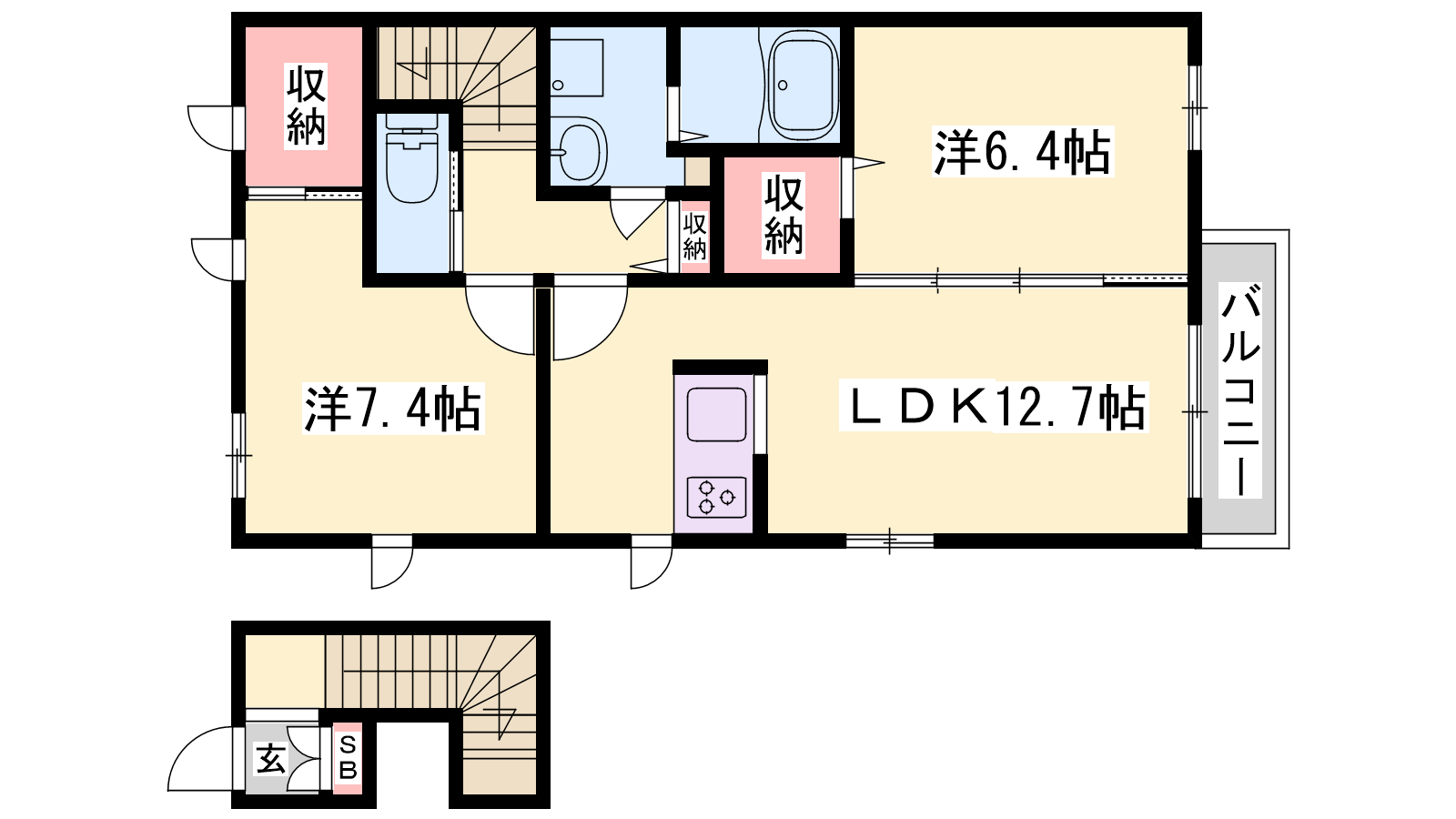 - LDK12.7帖、洋室7.4帖、洋室6.4帖
