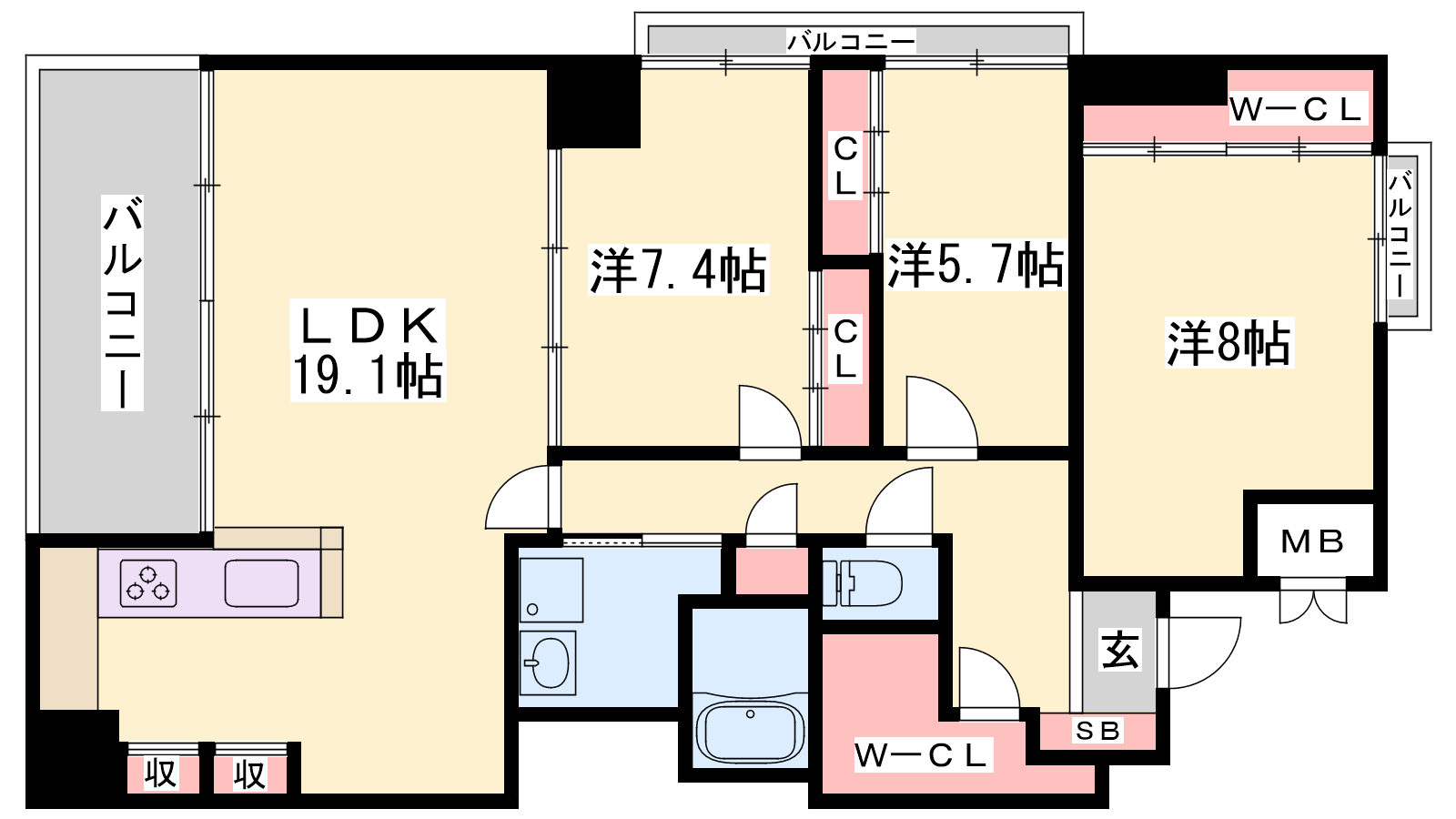 - LDK19.1帖、洋室8帖、洋室7.4帖、洋室5.7帖